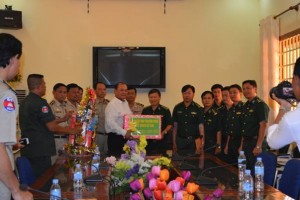 Đại tá Nguyễn Văn Phương – Chính ủy BĐBP Bình Phước tặng quà Ty công an tỉnh KraTie nhân dịp tết Chol Chnam Thmay