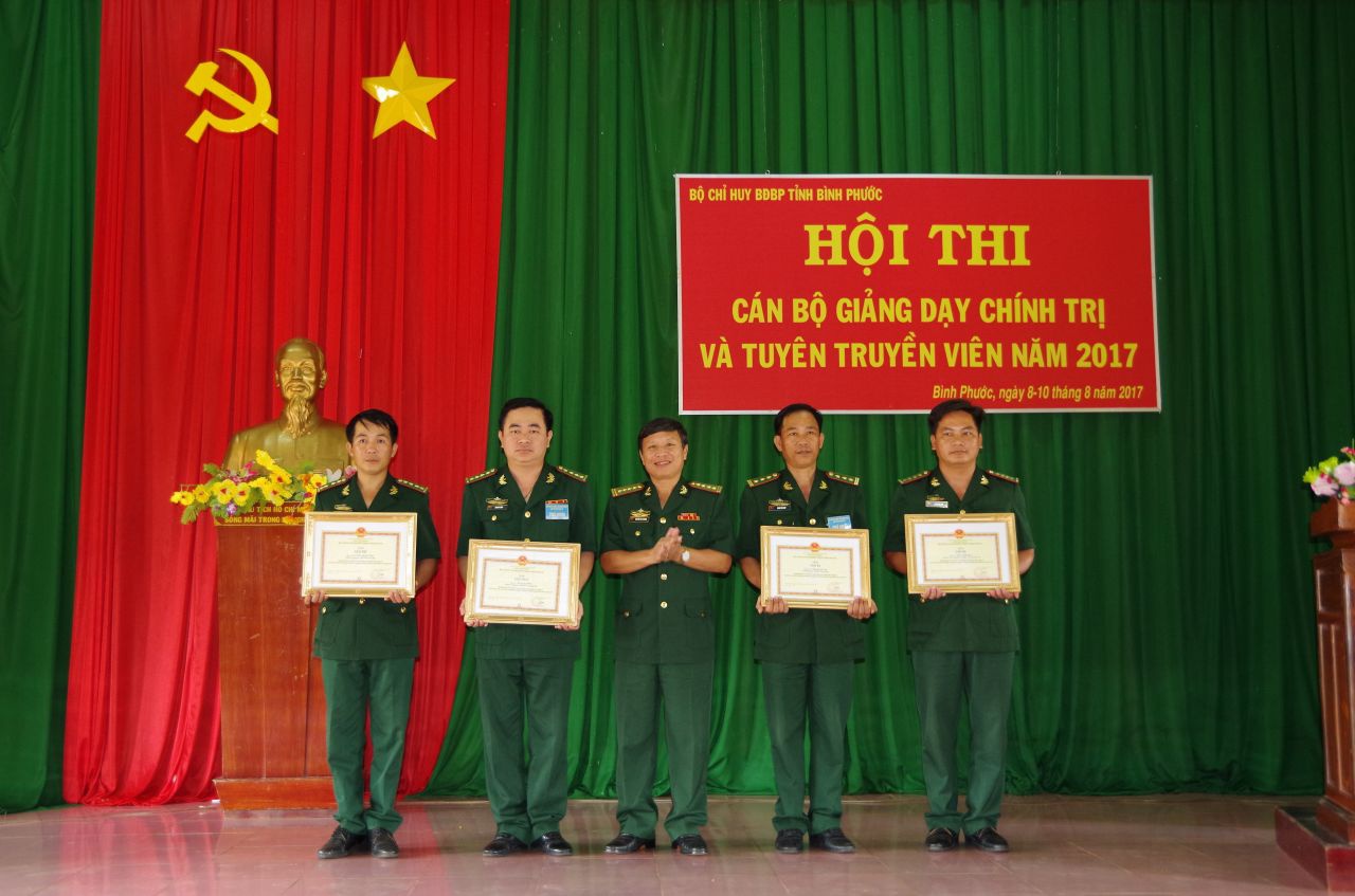 Đại tá Nguyễn Văn Phương Bí thư Đảng ủy, Chính ủy BĐBP tỉnh tặng khen thưởng cho các thí sinh đạt giải.
