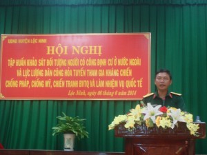 Thực hiện Công văn số 1408/UBND-NC ngày 16/5/2014 của Ủy ban nhân dân tỉnh Bình Phước, Hướng dẫn số 704/HD-BCH ngày 14/5/2014 của Bộ Chỉ huy Quân sự tỉnh, ngày 06/6/2014 vừa qua, Ủy ban nhân dân huyện Lộc Ninh đã tổ chức Hội nghị tập huấn công tác khảo sát đối tượng người có công định cư ở nước ngoài và lực lượng dân công hỏa tuyến tham gia kháng chiến chống Pháp, chống Mỹ, chiến tranh bảo vệ Tổ quốc và làm nhiệm vụ quốc tế cho gần 200 đại biểu là lãnh đạo các ban, ngành, hội, đoàn thể, Bí thư, Chủ tịch, Chỉ huy trưởng Ban chi huy Quân sự, Trưởng Công an, Mặt trận Tổ quốc, Hội Cựu chiến binh, cán bộ thương binh – xã hội các xã, thị trấn trong huyện.