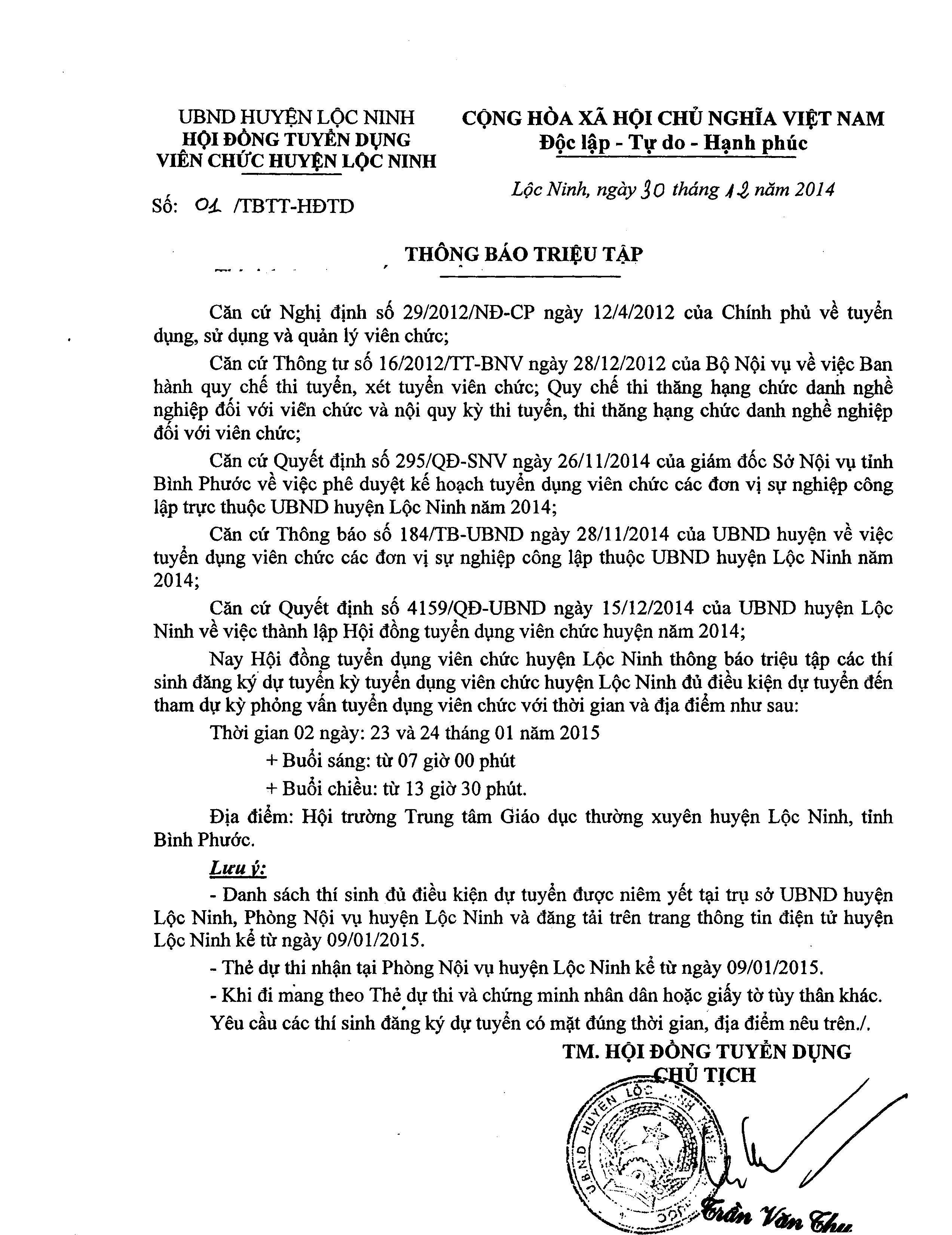 Thông báo triệu tập thí sinh phỏng vấn kỳ tuyển dụng viên chức huyện Lộc Ninh năm 2014