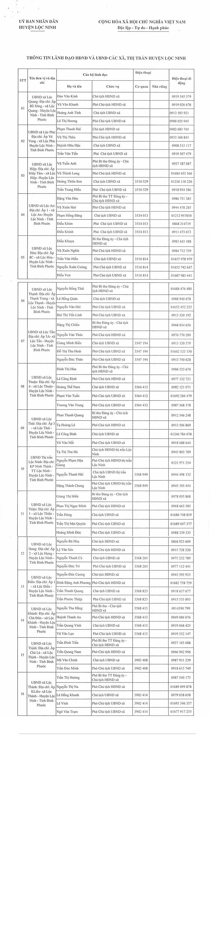 Thông tin lãnh đạo HĐND và UBND các xã, thị trấn huyện Lộc Ninh